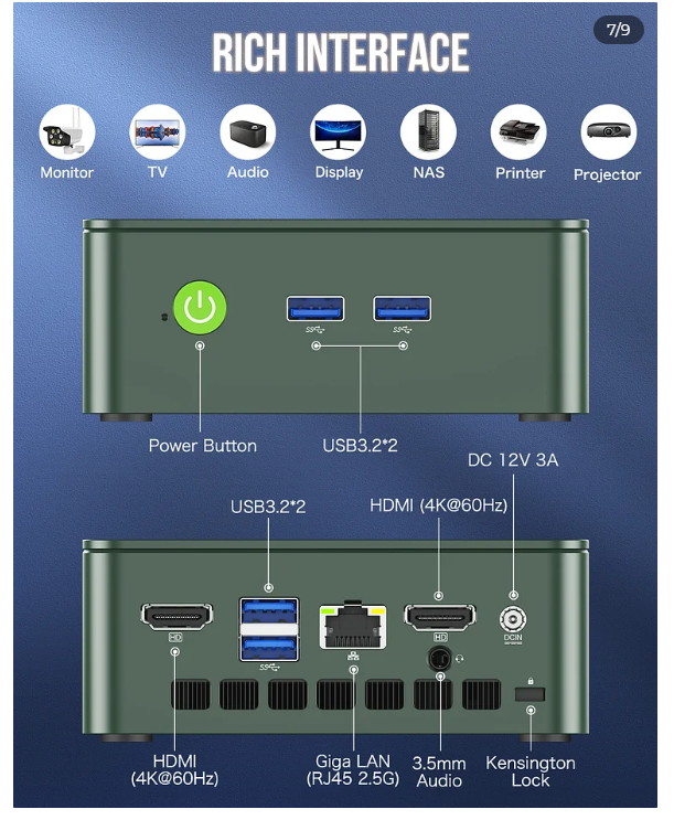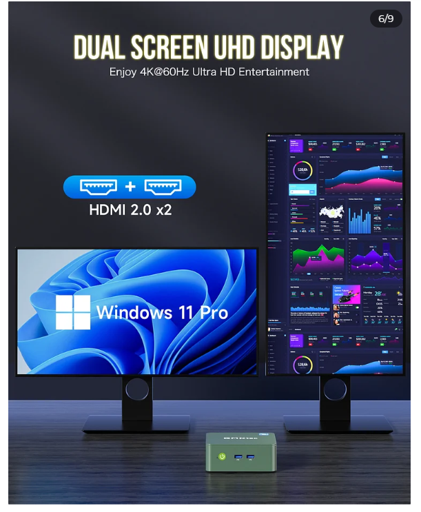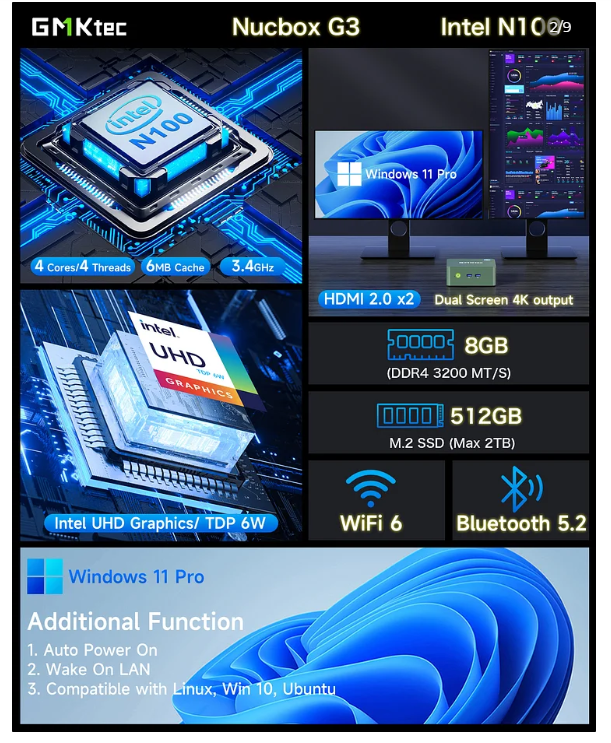 Intel 12th Alder Lake - N100, 4C/4T, 7nm, MAX3.4G, 6MB 캐시, TDP 6W Intel UHD 그래픽(최대 750MHz) 24개 실행 유닛, DDR4 3200MT/s, SO-DIMM*1, 최대 32GB, M.2 NVMe PCIe 3.0 M.2 2280, 최대 2TB Window 11 Pro(설치됨), Linux BT5.2/WiFi 6 2 디스플레이 지원--HDMI(4K@60Hz)*2 USB3.2( Gen1*1 5Gbps/S)*4 / HDMI*2 4096 x 2160@60Hz/ 1*3.5mm 헤드폰 잭 / Giga LAN(RJ45)*1 2.5G/ 0.79lb/ 361g DC IN(5.5/2.5mm), 12V /3A