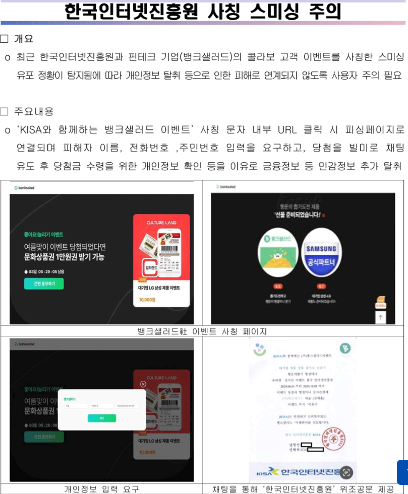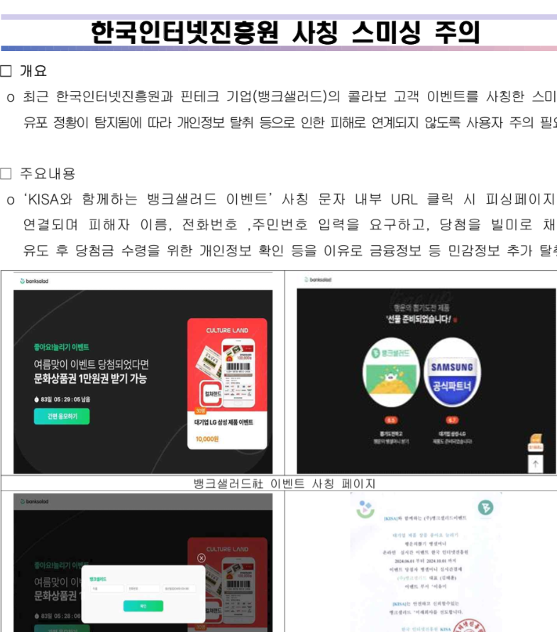 지난달에 한국인터넷진흥원과 뱅크샐러드 콜라보 이벤트라며 사기 문자가 퍼진 적 있다고 합니다.