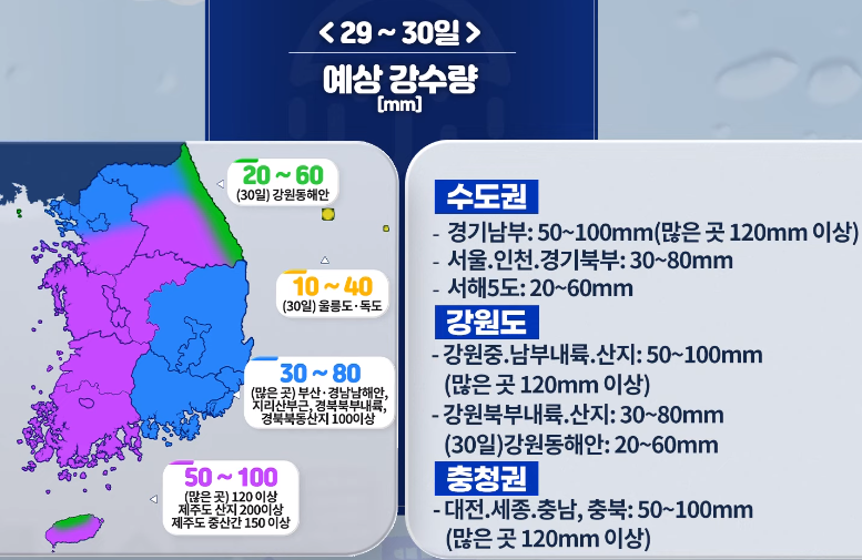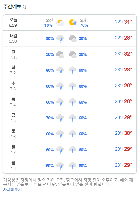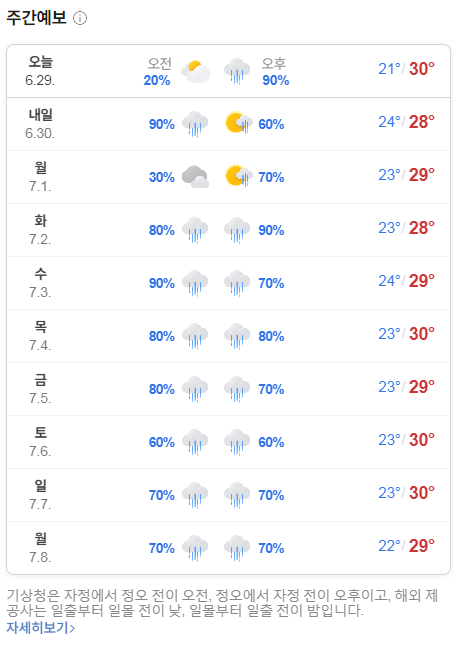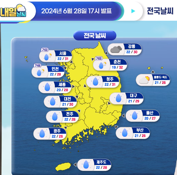 2024.6.29(토)~7.7(일) 일기예보. 장마 시작입니다. 토요일 느지막이부터 일요일까지 ★ 수도권포함 많은 비 예상 본문