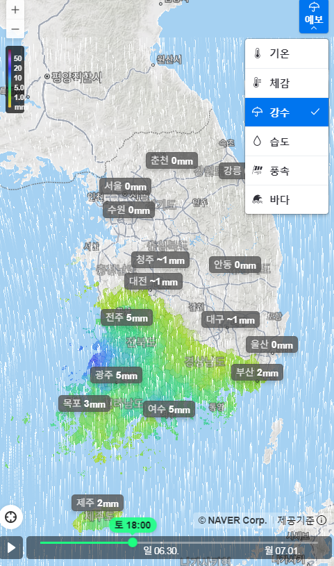 6시간단위로 자른 것입니다. 출처는 위 네이버 날씨 > 지도.