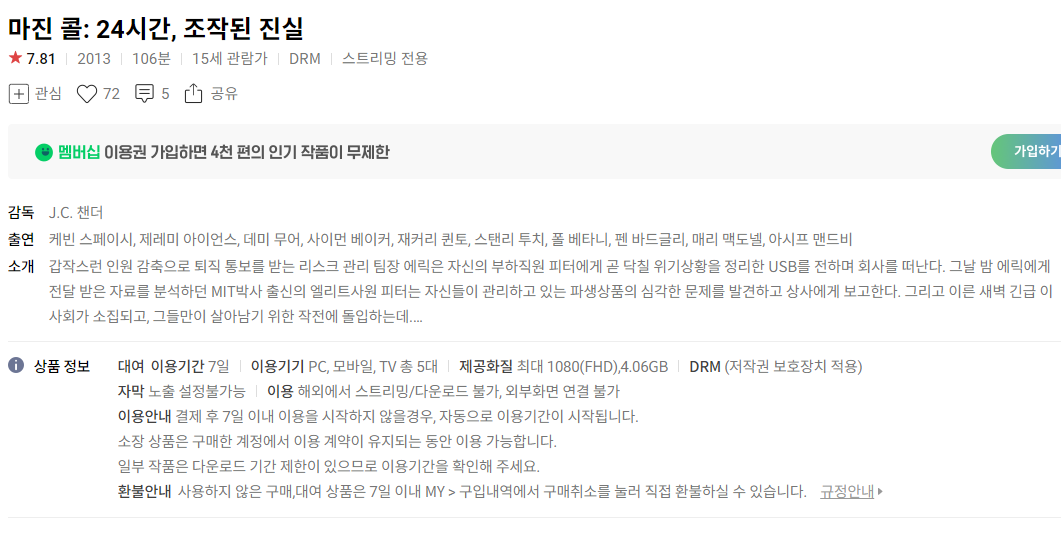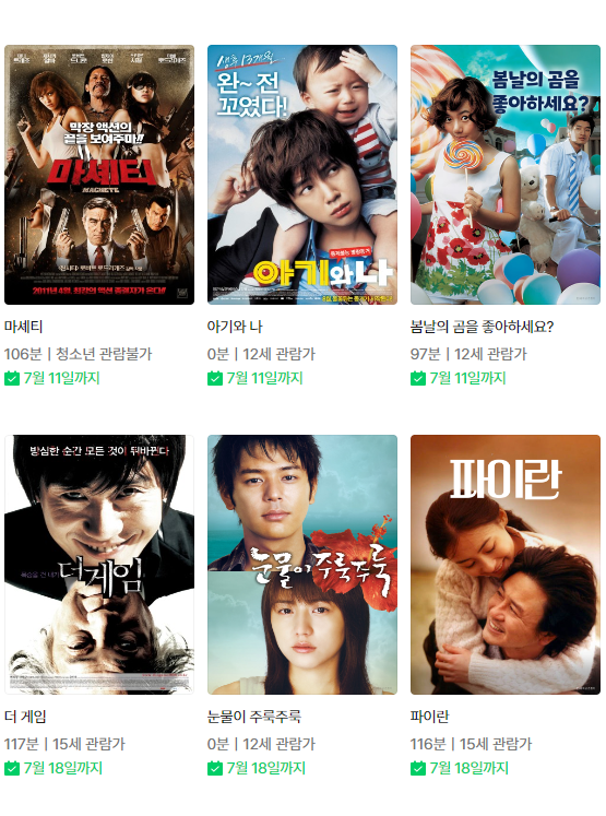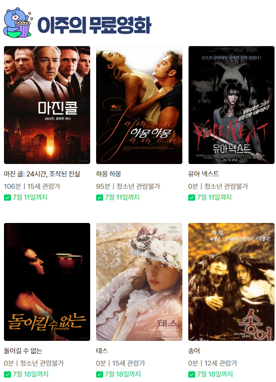 (네이버시리즈온 무료영화) 마진 콜:24시간,조작된 진실, 테스, 송어, 아기와 나, 봄날의 곰을 좋아하세요?, 더 게임, 눈물이 주룩주룩, 파이란 등