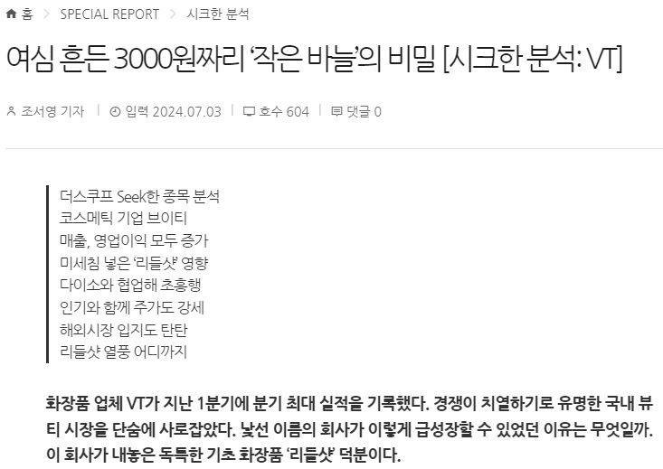 화장품 업체 VT가 지난 1분기에 분기 최대 실적을 기록했다. 경쟁이 치열하기로 유명한 국내 뷰티 시장을 단숨에 사로잡았다. 낯선 이름의 회사가 이렇게 급성장할 수 있었던 이유는 무엇일까.