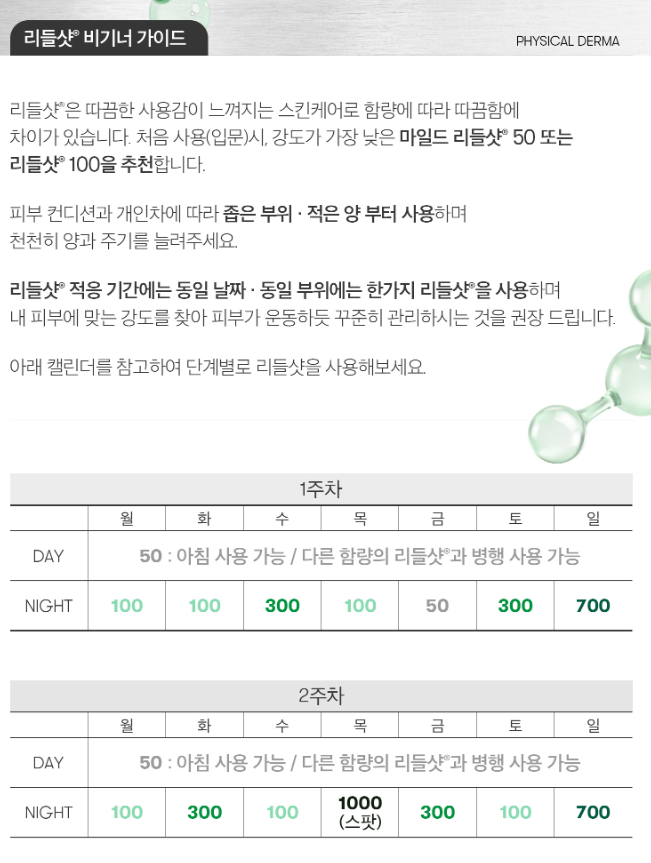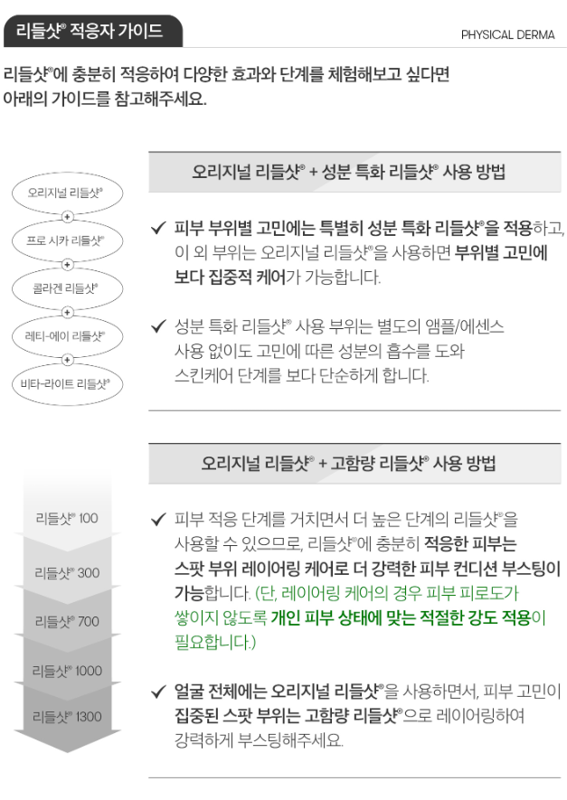 피부에 상처를 주는 방식이라서, 몇 가지 강도로 나누어 제품군이 구별돼 있어 사용 주기와 자기 피부에 맞는 걸 골라 사용하는 방식.