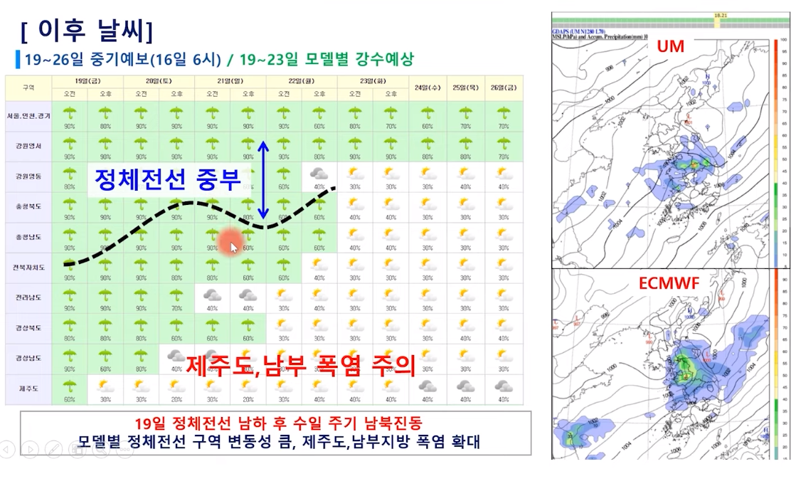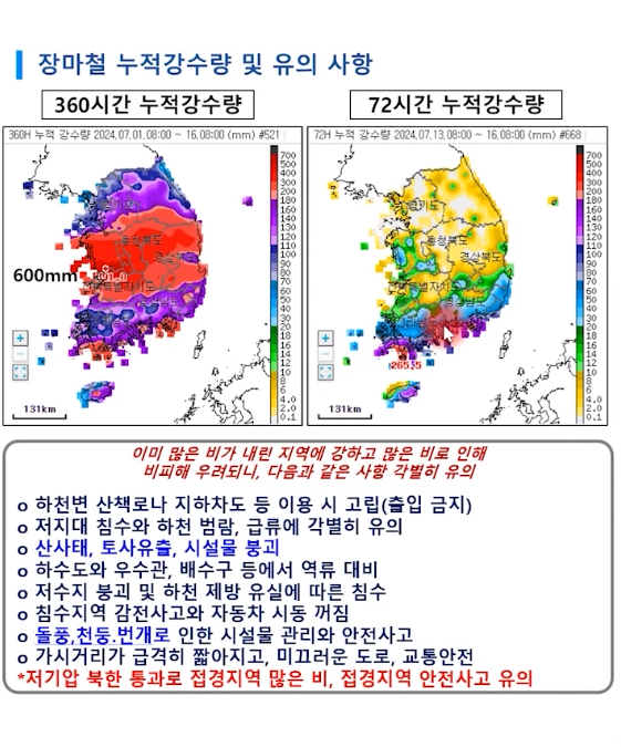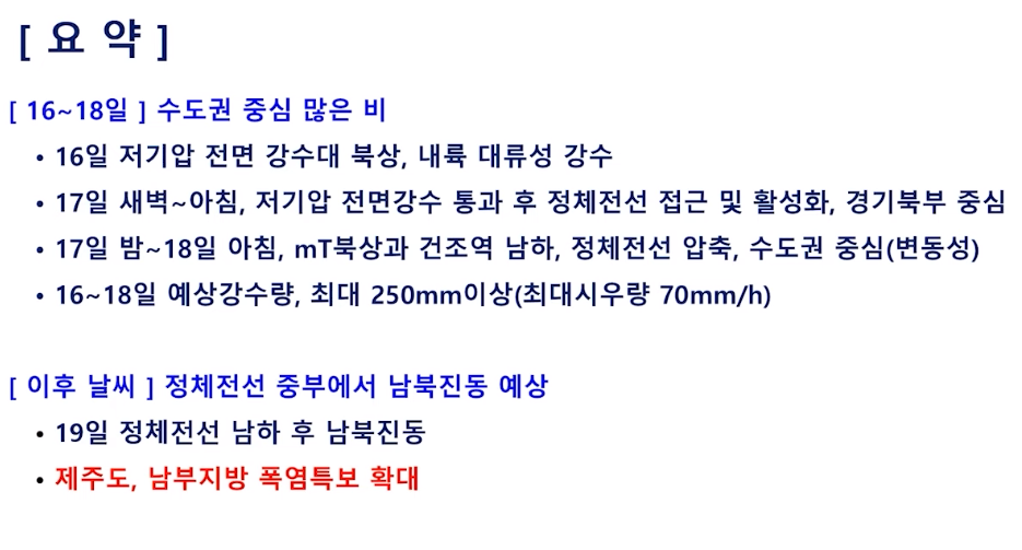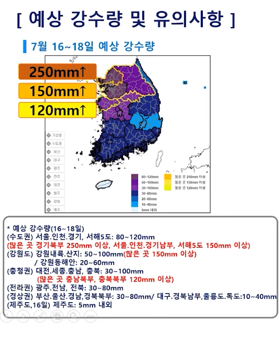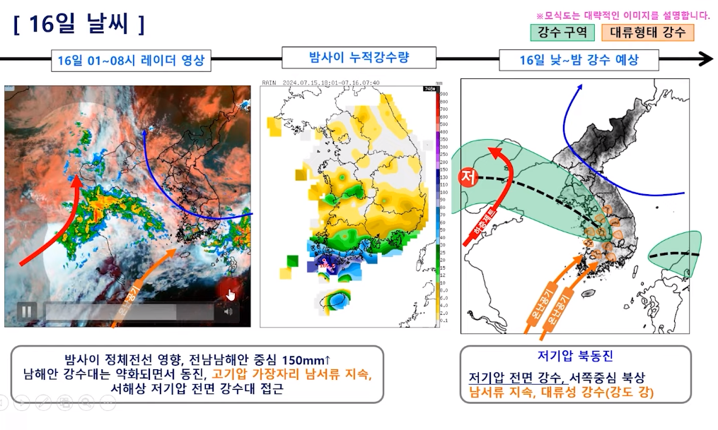 중부지방 비 시작! 밤 사이 수도권 집중 호우 주의! 남부는 폭염 (24년 7월 16일 기상청 예보브리핑)