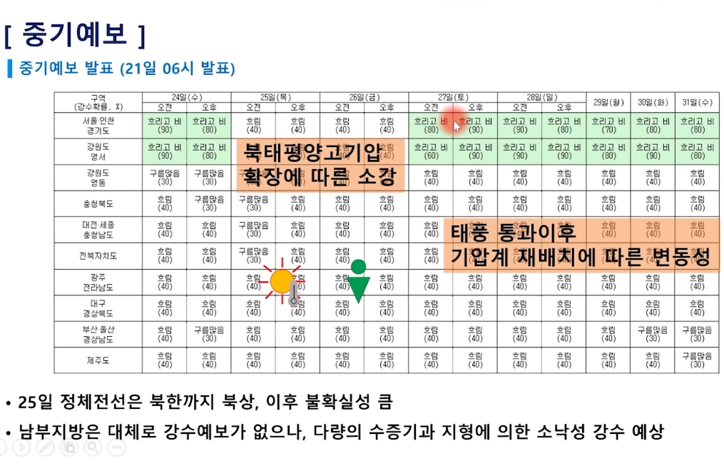 태풍진로에 밀려 정체전선이 올라갔다가 다시 내려올 것이라고.