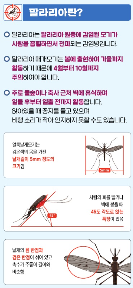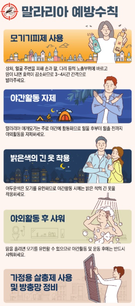 질병관리청 - [리플릿] 말라리아 예방수칙(모기에 물리지 않는 것이 말라리아 예방의 최선입니다!) 2024.5.17