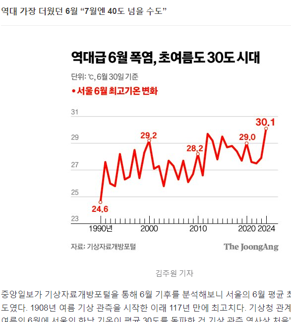 서울 6월 사상 첫 평균 30도…폭염∙폭우 '복합재해' 온다 - 중앙일보 2024.07.01.