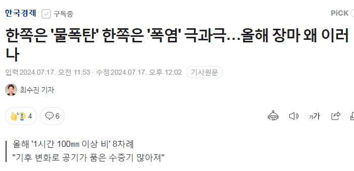 한쪽은 '물폭탄' 한쪽은 '폭염' 극과극…올해 장마 왜 이러나 - 한국경제 2024.07.17