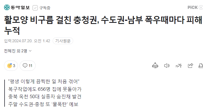 활모양 비구름 걸친 충청권, 수도권-남부 폭우때마다 피해 누적 - 동아일보 2024.07.20