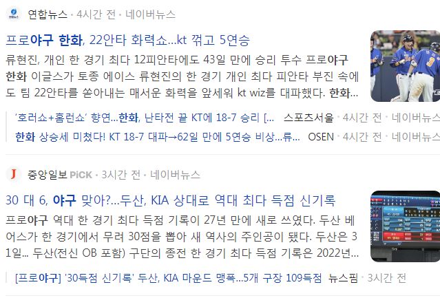 두산 베어스는 기아 타이거즈에 30:6 승리, 한화 이글스는 KT 위즈에 18:7 승리 본문