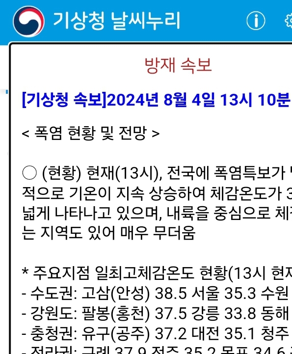 [기상청 속보]2024년 8월 4일 13시 10분