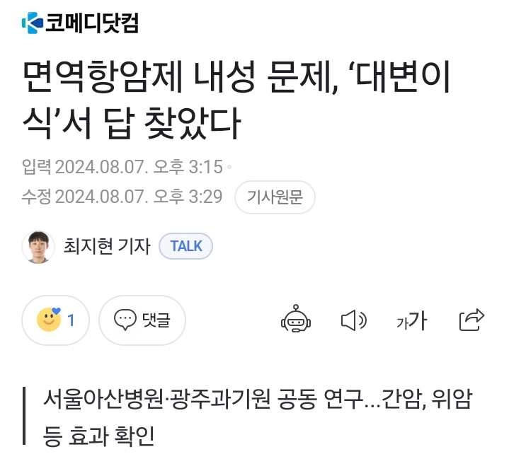 (......) 대변을 이식한 환자들은 다시 면역항암제 치료를 시작했는데, 그 결과 이식 8주 후 절반에 가까운 환자에서 치료 효과가 다시 나타나기 시작 (......) 면역항암제 내성을 극복하는 데 도움을 주는 장내 유익균을 새롭게 발견하고 '프레보텔라 메르대 이뮤노액티스'로 이름 붙였다. '박테로이데스 플레비우스'균과 '락토바실러스 살리바리우스'균 등은 면역항암제 치료 효과를 억제하는 유해균이라는 사실도 발견했다. (......) - 코메디닷컴 2024