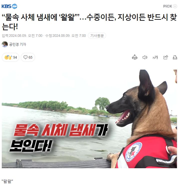 수상 보트에 올라 강을 지그재그 방향으로 순회하면서 수면으로 올라온 부패 가스를 탐지한 순간, 체취증거견이 '왈왈' 짖으며 이를 알린 겁니다. - KBS 2024