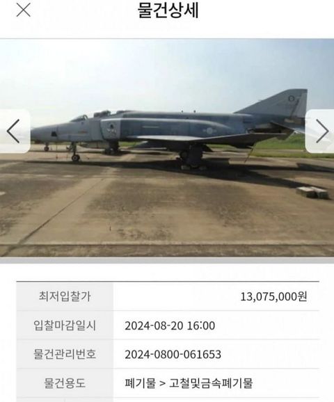 지난 6월 고별 국토순례비행까지 하면서 55년에 걸친 임무를 마치고 명예롭게 퇴역한 F-4 팬텀 전투기 일부가 고철 신세로 공매장에 올라왔다. 18일 한국자산관리공사 공매 포털 온비드에 따르면