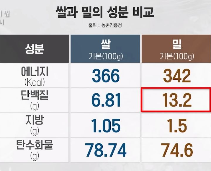 쌀, 밀, 밀가루의 성분비교