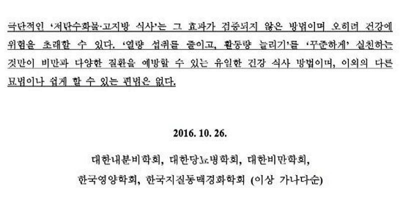 저탄고지가 유행한 다음, 관련 의사학회들은 이거 하지 말라고 성명을 냈다고.