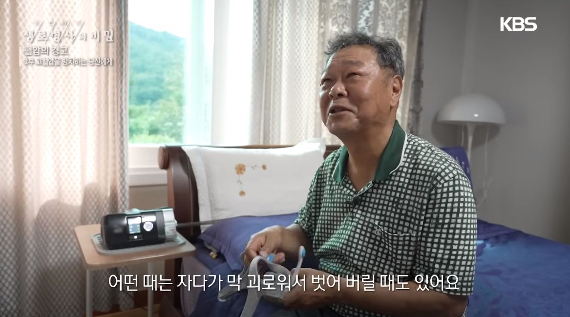 혈압수치는 약효가 제대로 듣는 결과로 나오는데, 양압기는 처음 써보면 답답하다며 웃음.