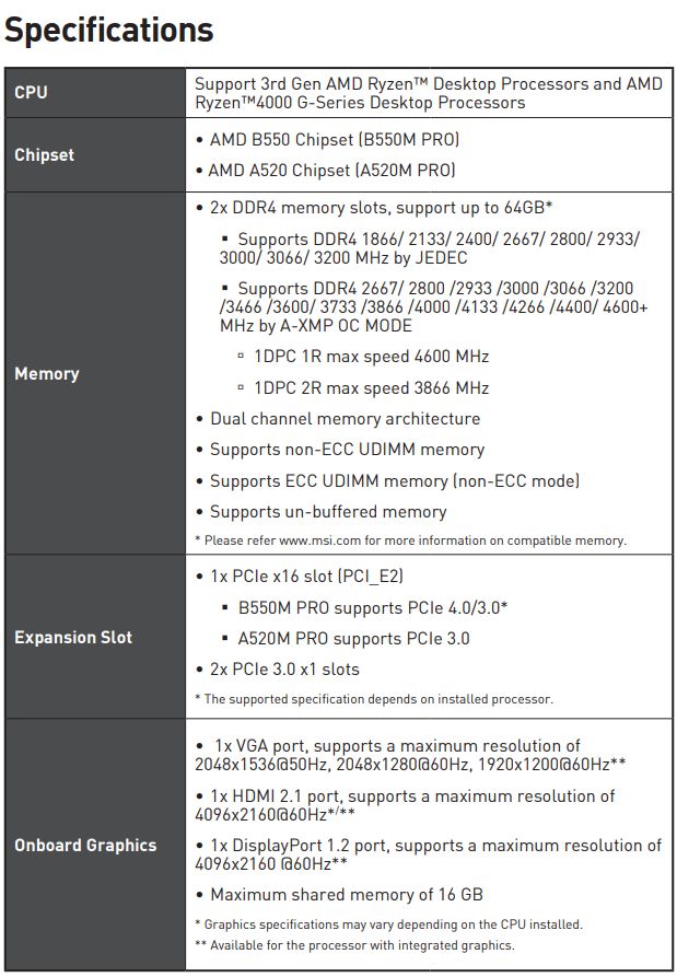 Powered by AMD Ryzen AM4 processors, the MSI A520M PRO combines stable functionality and high-quality assembly to solve professional workflows. Core boost, DDR4 boost with A-XMP. Equipped with a Turbo M.2 with M.2 Shield Frozr, it grants you access to the