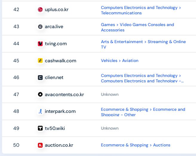 우리나라 쇼핑몰사이트들은 30~50위 사이에 있네요. 티메프사태로 타격받은 인터파크, 그 외 네이버 쇼핑을 제외하면, 지마켓, SSG.COM, 옥션 모두 신세계 계열사. 분발하기를 바랍니다.1