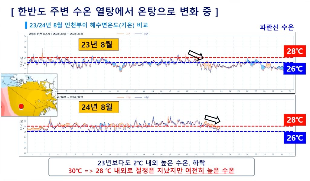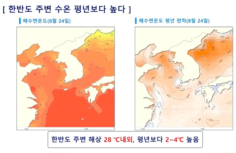 한반도 주변 수온, 28도 내외로 평년보다 2~4도 높음.