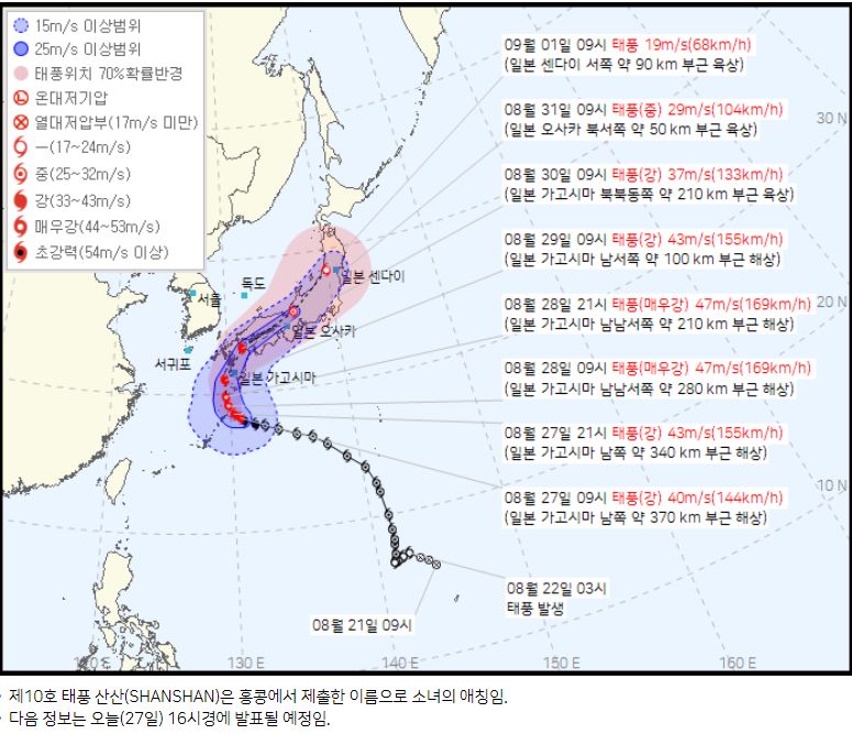태풍 산산 - 기상청 통보문. 27일 오전 발표기준