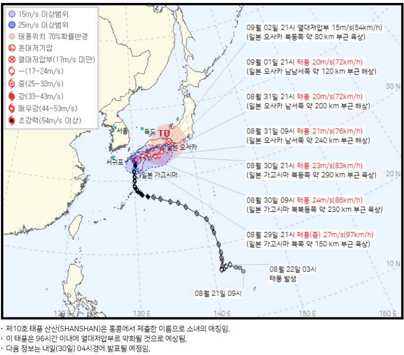 2024.8.25 낮) 제 10호 태풍 산산, 일본 큐슈-시코쿠에 상륙해 동해의 일본 서부해안으로 빠져나갈 전망 (0) | 2024.08.25 |