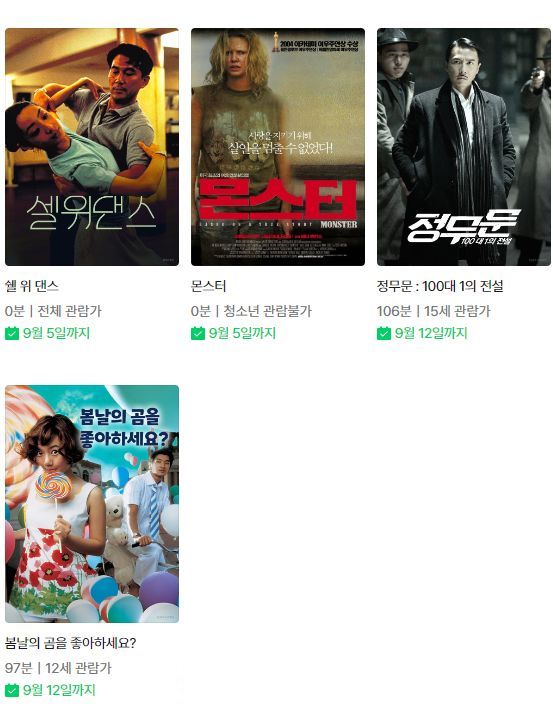 ~9.12까지.. 정무문:100대 1의 전설, 테스, 하나-비, 페어웰,마이 퀸, 봄날의 곰을 좋아하세요?