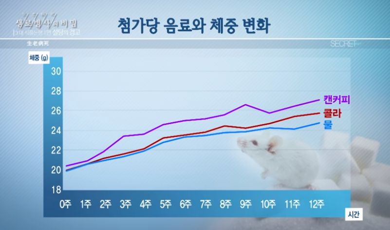 쥐에게 콜라와 캔커피를 12주간 먹이는 실험. 어떻게 했는지는 모르겠지만.