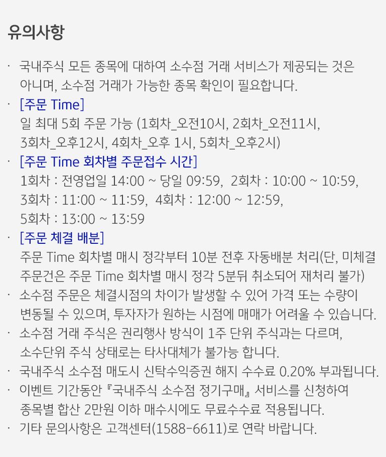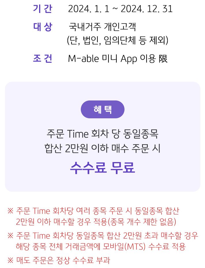 2024.12.31.까지, 주문 Time 회차당 동일종목 합산 2만원 이하 국내주식 소수점 구매 시 수수료 무료