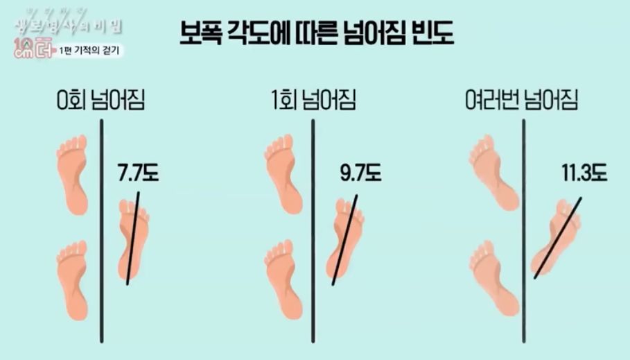 그리고 일자걸음이 건강하고 팔자걸음일수록 넘어지기 쉽다는 듯.