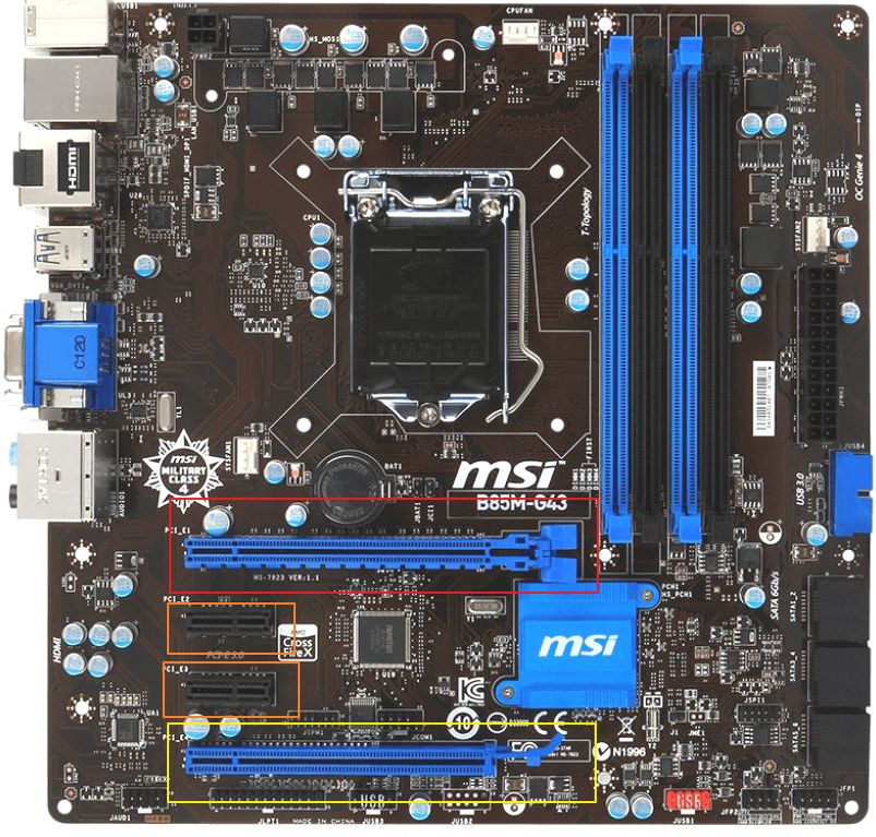 내 하스웰 메인보드( MSI B85M-G43 )는 x16 슬롯이 2개, x1슬롯이 2개 보이는데, x16슬롯은 1개는 Gen3이고 나머지 1개는 Gen 2다. x1 슬롯은 아쉽게도 Gen2. 그리고 NVMe 슬롯은 없다.
