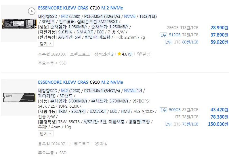 https://search.danawa.com/dsearch.php?query=ESSENCORE+KLEVV+CRAS+M.2+NVMe