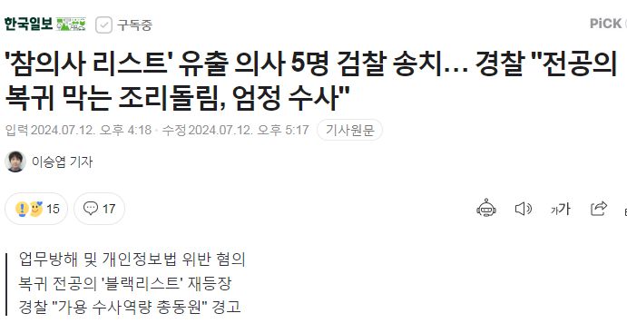 집단사직에 동조하지 않은 의사들 명단을 온라인에 공개하고 "참의사"라고 조롱한 의사들 검찰 송치 - 2024.7.12.한국일보