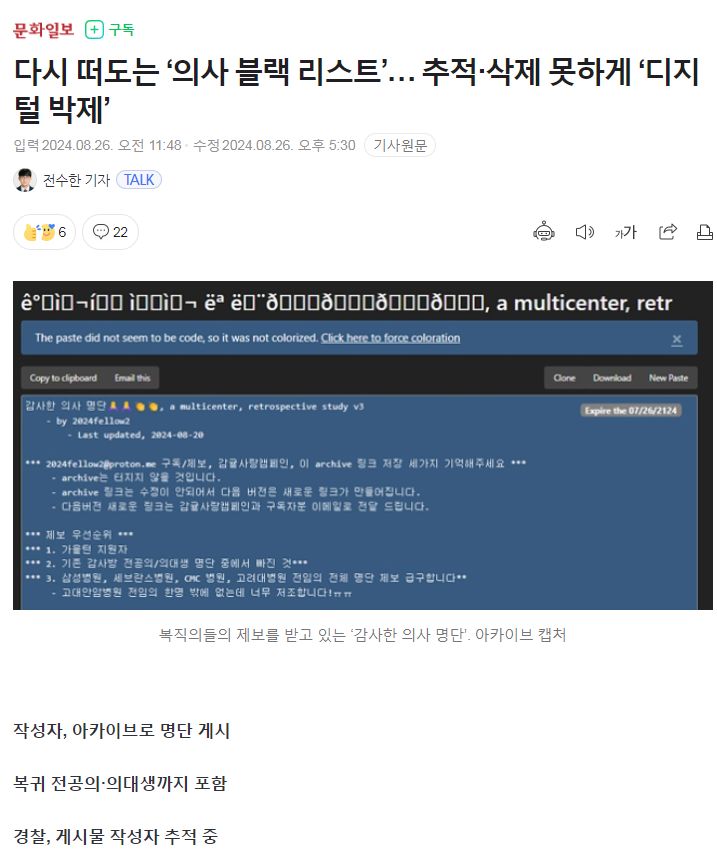 다시 떠도는 ‘의사 블랙 리스트’… 추적·삭제 못하게 ‘디지털 박제’ 근무 중인 의사, 복귀한 의사, 복학한 의대생 등 포함, 협박문구도 - 문화일보 2024.8.16