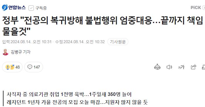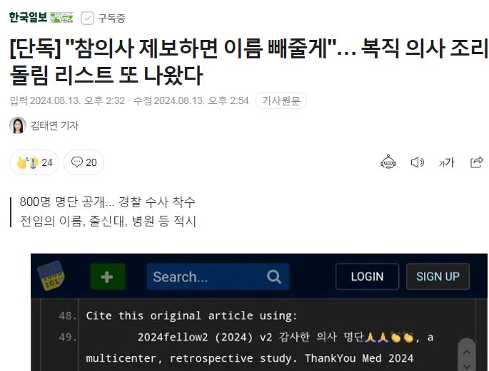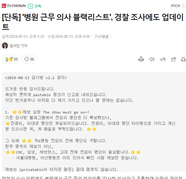 “감사한 의사” 복직 전공의 800여명 신상 털이…경찰, 조사 착수 - 세계일보 2024.8.13.