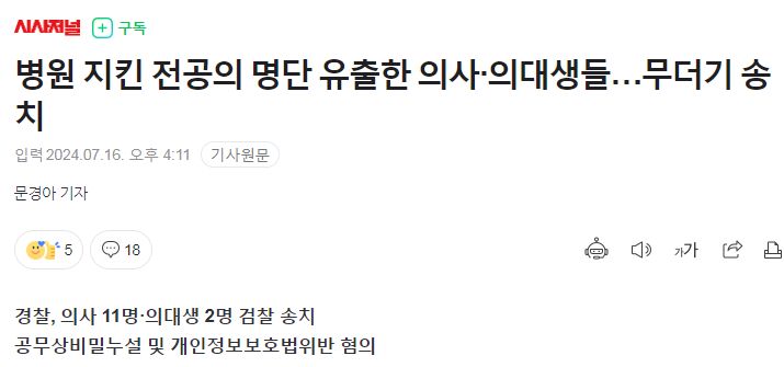 근무 중인 전공의와 병원에 파견된 공중보건의 명단을 온라인에 유포한 현직의사와 의대생, 검찰 송치 - 2024.7.16. 시사저널