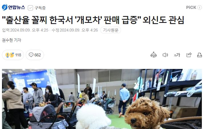 세계 최저 수준 출산율을 보이는 한국에서 유모차보다 반려견을 태우는 이른바 '개모차'가 더 많이 팔리고 있는 상황에 외신도 관심을 보였다. 미국 일간 월스트리트저널(WSJ)은 8일(현지시간) 서