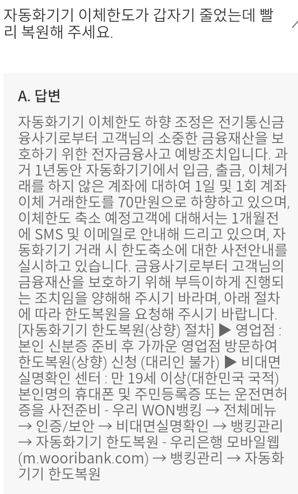 ▶ 비대면 실명확인 센터 : 만 19세 이상(대한민국 국적) 본인명의 휴대폰 및 주민등록증 또는 운전면허증을 사전준비 - 우리 WON뱅킹 → 전체메뉴 → 인증/보안 → 비대면실명확인 → 뱅킹관리 → 자동화기기 한도복원 - 우리은행 모바일웹(m.wooribank.com) → 뱅킹관리 → 자동화기기 한도복원