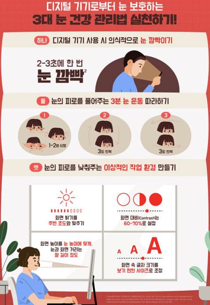 "디지털 기기를 장시간 이용해야 한다면 2~3초에 한 번씩 눈을 의식적으로 깜빡이고, 눈의 피로를 풀어주는 3분 눈 운동을 수시로 시행하며, 이상적인 디지털 작업 환경을 갖추는 것이 눈 건강을 지키는 데 도움