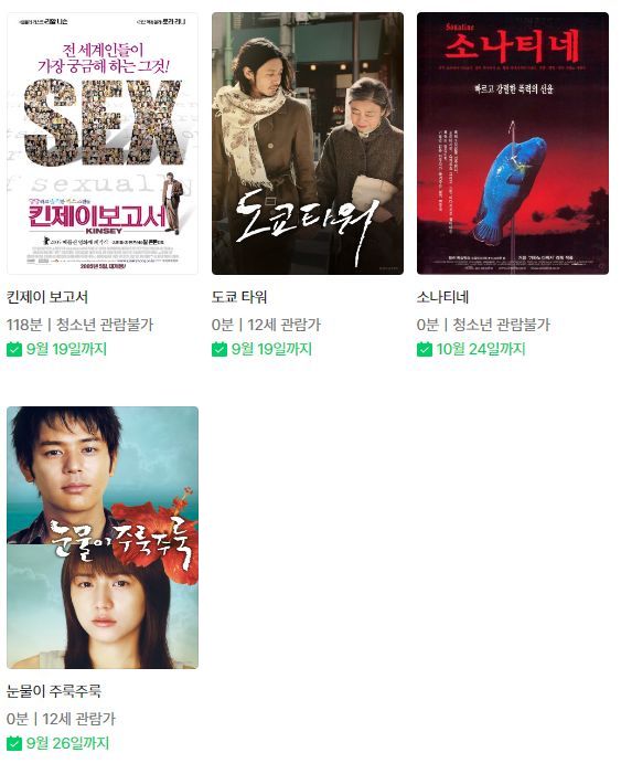 | (네이버시리즈온 무료영화) 하나-비, 테스, 봄날의 곰을 좋아하세요?, 허니와 클로버, 도쿄 타워, 불량 공주 모모코, 페어웰,마이 퀸 등 (0) | 2024.09.06 |
