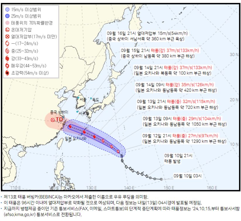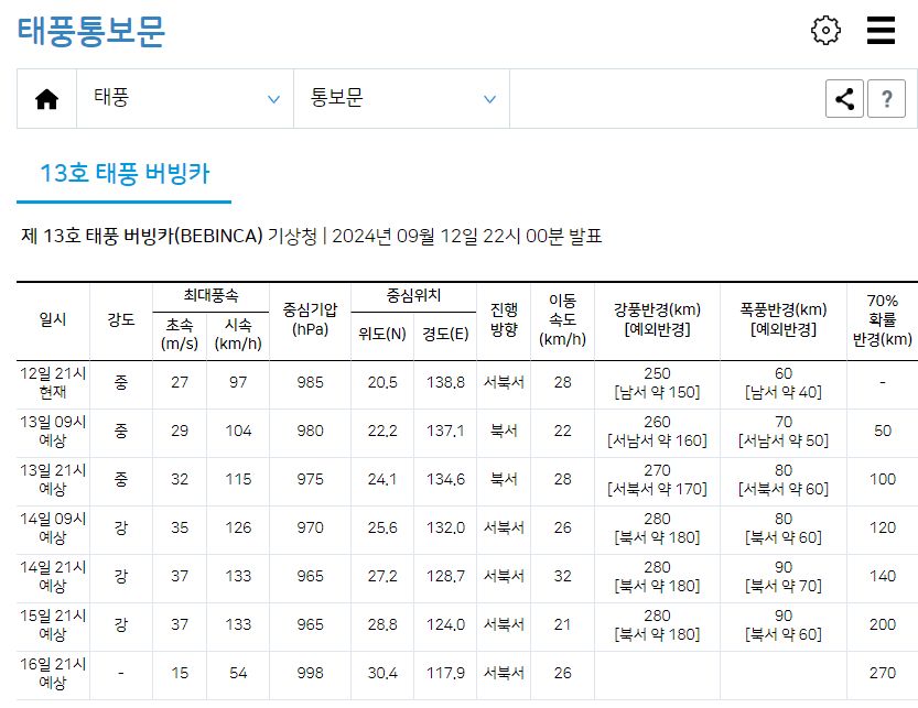 태풍통보문: 제 13호 태풍 버빙카(BEBINCA) 기상청 | 2024년 09월 12일 22시