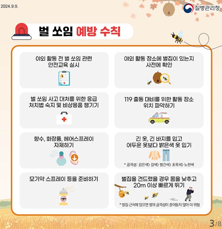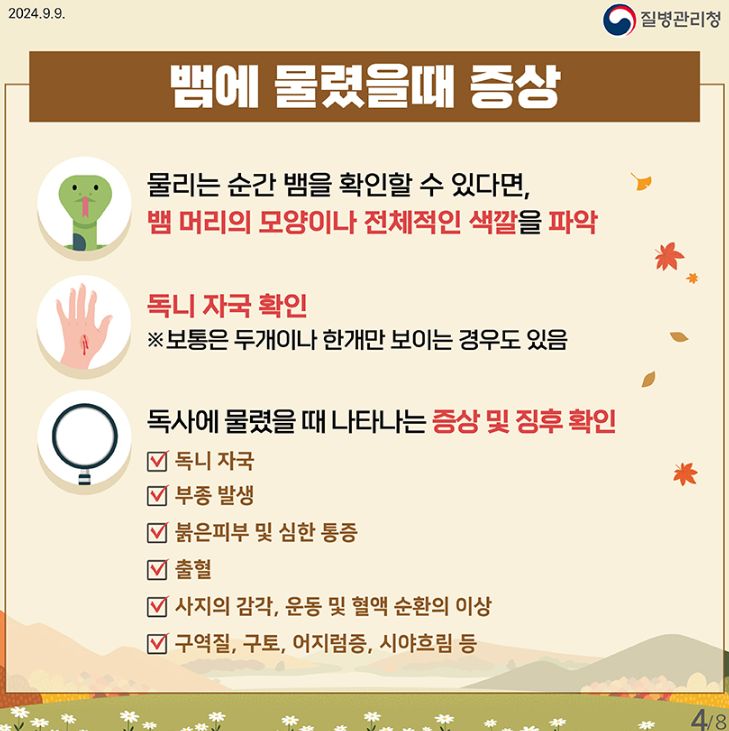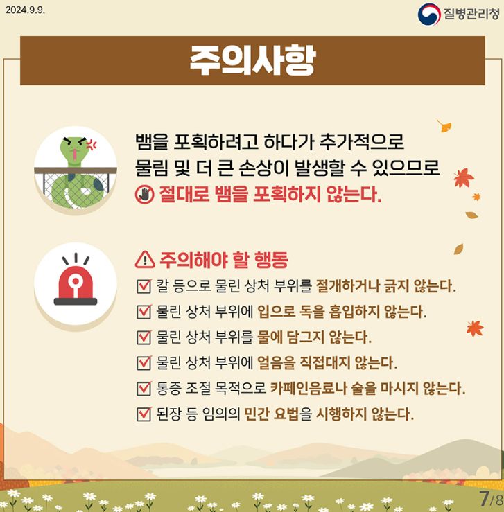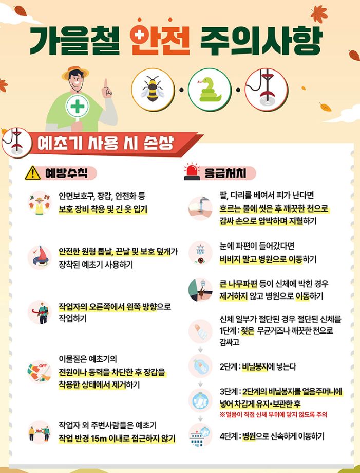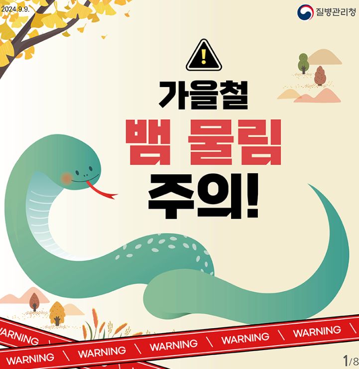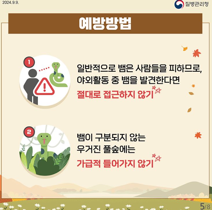 벌 쏘임 예방법, 가을철 뱀 물림 주의!, 가을철 안전 주의사항(예초기) (질병관리청 카드뉴스) 본문