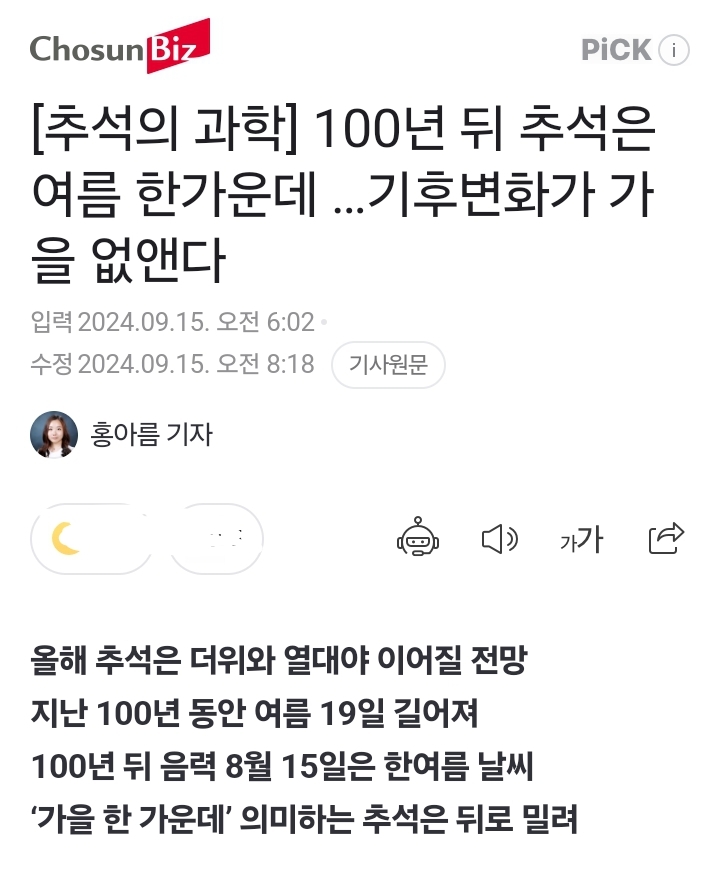올해 추석은 더위와 열대야 이어질 전망 지난 100년 동안 여름 19일 길어져 100년 뒤 음력 8월 15일은 한여름 날씨 ‘가을 한 가운데’ 의미하는 추석은 뒤로 밀려 추석은 전통적으로 한 해의 수확
