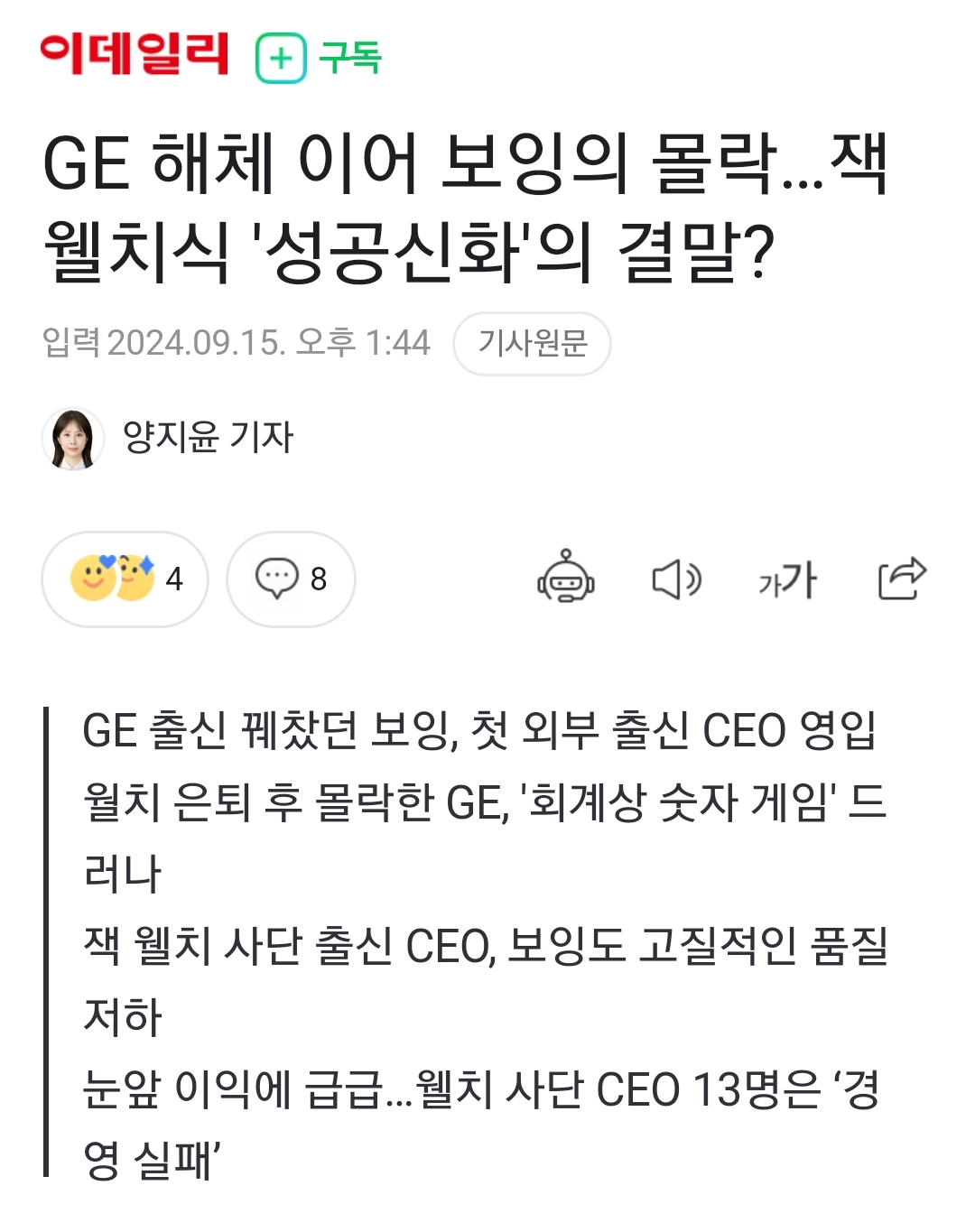(......) 웰치가 은퇴한 뒤 GE는 몰락 (......) 웰치의 경영 공백이 문제가 아니었다. 그간 GE가 M&A를 통해 덩치를 키우고, 금융 자회사를 거대 기업으로 성장시키며 이른바 ‘회계상 숫자 게임’을 해왔던 방식이 드러나면서다. 수익이 높을 땐 GE캐피탈이 대출 준비금 명목으로 예비금을 숨겨두고, 실적이 부진할 때는 갑자기 분기 말 모기지 담보 증권을 발행해 수익을 끌어올리는 구조 (......) 2008년 미국 서브프라임 모기지 사태가 터지며 직격탄 (......) GE캐피탈은 파산위기에 처하며 연방 정부에서 1390억달러를 겨우 빌려 파산을 모면 (......) 급기야 올해 4월에는 3개 기업으로 분할 (......) - 문화일보 2024