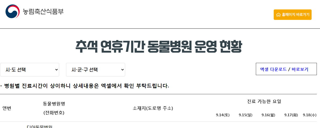 2024 추석 연휴기간 운영하는 동물병원 찾기 (농림축산식품부) 본문