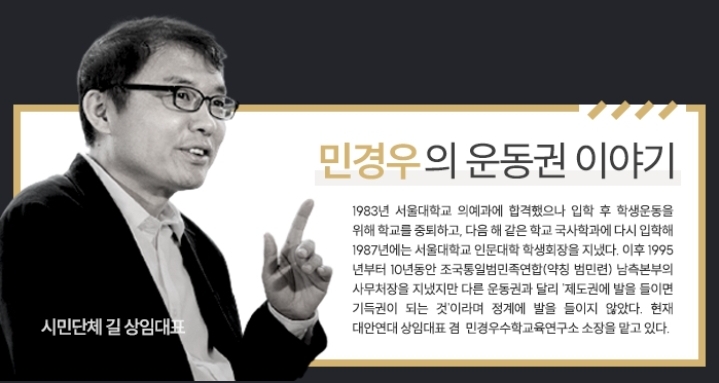 범민련 사무처장 출신 민경우가 본 2국가론 민경우(59) 시민 단체 ‘길’ 대표는 1995년부터 10년간 조국통일범민족연합(범민련) 남측본부 사무처장을 맡아 민족해방(NL) 계열의 ‘통일 운동’에