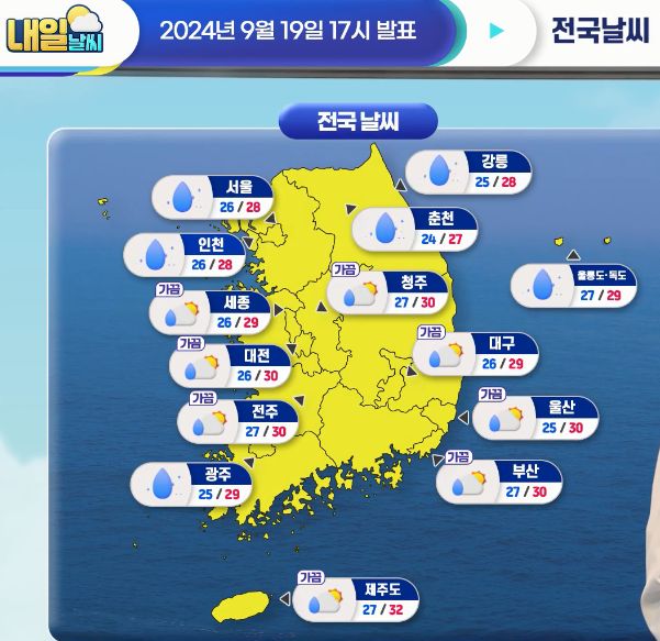 [내일날씨] 전국 더위 식히는 비, 천둥·번개 유의! 9월 19일 17시 기준