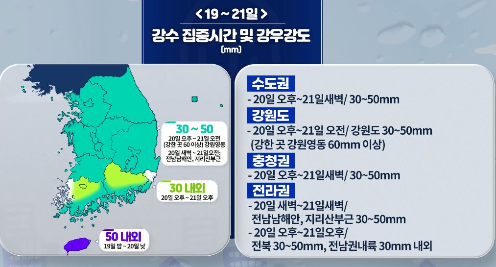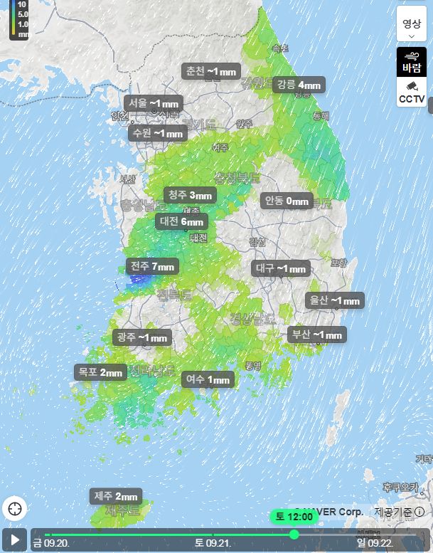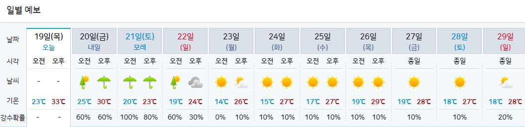 20~21일은 전국 비예보가 있습니다. 곳에 따라 일요일 오전까지. 호우예보가 나온 지방도 있습니다. 아래 내일예보와 주간예보의 지역별 강수량 부분을 잘 보세요.
