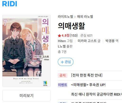 [코믹] 의매생활 작품소개: 이것은 언젠가 사랑으로 이를 지도 모르는 이야기.고등학교 2학년인 아사무라 유타는 아버지의 재혼을 계기로 같은 학교 미소녀 아야세 사키와 ‘남매’가 됐다.인사