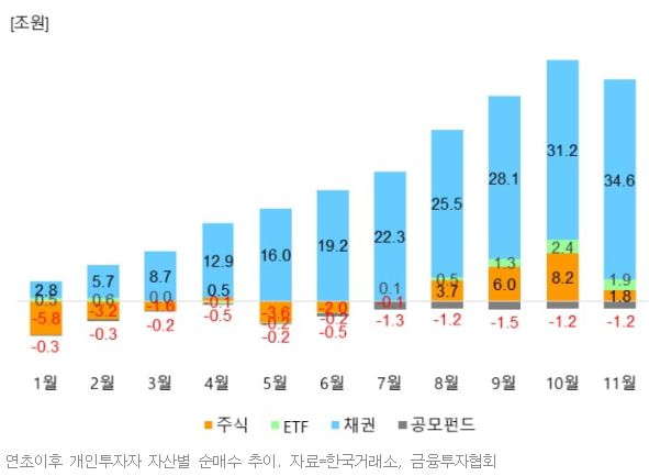 출처: 한국경제 2023.12.24. 올해 개인투자 '채권투자 전성시대' 연초 이후 11월까지 34.6조 순매수